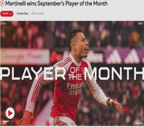 官方:马丁内利被球迷票选为了队内9月份最佳球员,巴西人得到了54%的支持。