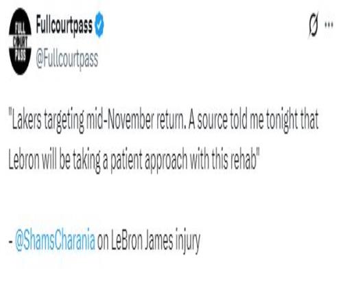 北京时间10月16日,湖人核心球星詹姆斯正在养伤,究竟他何时才能复出?据ESPN名记Shams报道,湖人计划让詹姆斯11月中旬复出,一位消息人士称,詹姆斯将耐心进行伤病恢复;詹姆斯伤停,湖人又添伤病,范德比尔特意外受伤退赛。