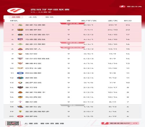 积分榜方面,皇马前9轮8胜1负,继续以2分优势领跑,巴萨22分紧随其后。比利亚雷亚尔17分排在第三,马竞、贝蒂斯分列第四、第五。